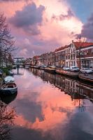 Leiden - De Utrechtse Veer weerspiegeld in de gracht (0123). Deze betoverende foto legt de serene pracht van Leiden vast tijdens een kalme zonsondergang. De gracht weerspiegelt de majestueuze grachtenpanden en het Utrechtse Veer, terwijl de avondlucht overgaat van een diepblauwe tint naar een zacht roze en oranje.