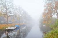 Leidse gracht in de vroege morgen met mooie spiegeling van het water en de opkomende zon. Bladeren verkleuren al naar herfsttinten en het vroege zonlicht maakt het af.