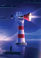 Een reusachtige hand die een vuurtoren vasthoudt als zaklamp leidt een eenzame schipper door de donkere wateren. Dit pakkende beeld symboliseert hoop, begeleiding en de zoektocht naar een betere toekomst.