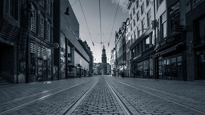 Uniek beeld van een leeg Rokin, op 16 april 2020, 15:15