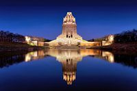 Monument voor de Volkerenslag Leipzig bij blauw uur met reflectie