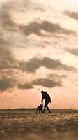 Op deze foto zie je een man met zijn hond, zijn trouwste vriend, uitgelaten spelend op het strand op een dag vol grauwe, dreigende wolken. Net op dit moment breekt de zon door en brengt het landschap tot leven met een dramatisch spel van gouden licht en schaduw. Het was zo’n moment dat je het liefst in een flesje wilt stoppen om het later nog eens te kunnen beleven.