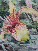 Aquarel van een bloeiende lelie in geel en bordeaux tegen een achtergrond van groene planten en bladeren