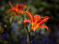 Close-up van een Oranje-rode Lelie met op de achtergrond een out of focus herhaling.
