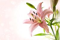 Leliebloem met roze bloemblaadjes, meeldraden, stamper en groene bladeren tegen een heldere bokeh achtergrond met kopieerruimte, geselecteerde focus
