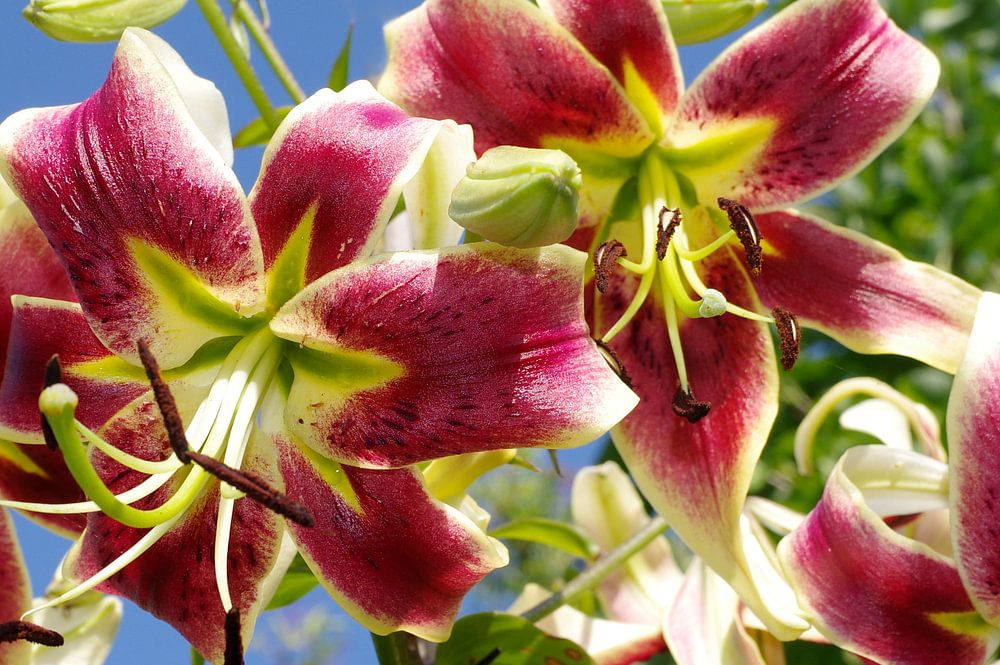 Een rood-witte lelie steekt af tegen een blauwe lucht.