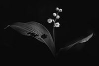 In de duisternis van het bos wordt de lelietjes-van-dalen verlicht door een straaltje zonlicht.