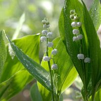 Lelietjes van dalen in een natuurlijke omgeving bevochtigd door ochtenddauw