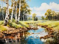 Dit kunstwerk toont een idyllisch landschap gedomineerd door een rij ranke berkenbomen aan de oever van een kalm water. Hun witte bast contrasteert met het weelderige groen en geel van het gras en de bomen op de achtergrond. De weerspiegeling in het water verdubbelt de schoonheid van de scène en creëert een symmetrie die het oog van de kijker kalmeert. Door de weergave van licht en schaduw lijkt het tafereel levendig, alsof de wind door de bladeren waait. Kleine details zoals de bloemen op de oever en de bladeren in het water geven het beeld diepte en nodigen uit tot ontdekken.
