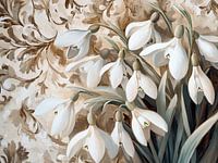Lente Bloemen Schilderij - Dit is een bloemenschilderij waarop een groep sneeuwklokjes op een gedetailleerde beige en bruin getinte achtergrond met bloemmotieven zichtbaar is.