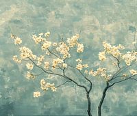 De subtiele kleurnuances van blauw en grijs in de achtergrond creëren een rustige en serene atmosfeer, die de schoonheid van de bloeiende takken accentueert. De bloemen, in tinten van zacht wit en crème, lijken bijna te dansen in het licht, waardoor een gevoel van vrede en vernieuwing ontstaat. De kunstenaar heeft met zorg de fijne details van de bloesems en de elegante vorm van de bomen vastgelegd, waardoor het werk een delicate en dromerige kwaliteit krijgt.