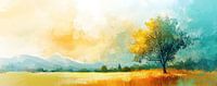 Lente Boom | Boom Geel - In dit landschap schilderij zie je een mooie boom met gele bladeren die staat in een goudgele weide, terwijl de lucht een warme mix van zacht blauw en oranje tinten heeft, wat een rustige sfeer oproept.