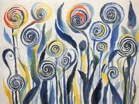 Wervelende, kleurrijke bloemen zijn op een levendige en grillige manier afgebeeld. Blauwe, groene, gele en rode tinten versmelten tot een abstract bloemenpatroon tegen een lichte achtergrond.