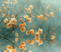 De bloesems, zacht en etherisch, springen in het oog met hun subtiele tinten van wit en oranje, die harmonieus afsteken tegen de dromerige, aquamarijn-gekleurde achtergrond. De takken, fijn en sierlijk, buigen onder het gewicht van de bloemen, waardoor een gevoel van natuurlijke elegantie en rust wordt opgeroepen. De reflectie van de bloemen in het waterige oppervlak beneden voegt een extra laag van diepte en sereniteit toe, suggererend een parallelle wereld van rust en schoonheid.