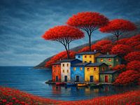 Op de rustige zee; stralen de geschilderde huizen een zacht licht uit,; terwijl karmozijnrode bomen de stilte bewaken.; Boten rusten op het water; als zachte gedachten; die de avond niet wil laten verdwijnen.; En de lente komt langzaam aan,; met de geur van bloemen; en een tedere weemoed in het hart.