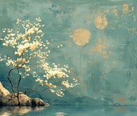 Dit trendy, rustgevende schilderij toont een sereen landschap, gekenmerkt door een delicate boom met witte bloesems die zich elegant uitstrekt tegen een rustige, blauwgroene achtergrond.