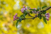 Een sfeervolle lentefoto van de bloeiende bloesem van een sierappelboom. Door de beperkte scherptediepte veranderd de achtergrond in in fraai gekleurd bokeh.