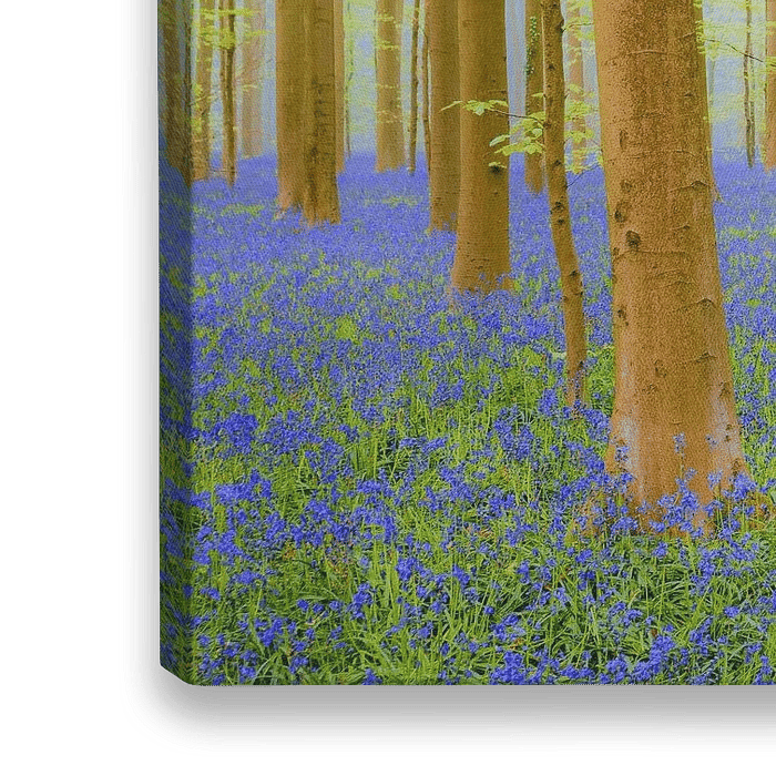 Wilde Hyacinten die bloeien in het Hallerbos tussen de frisse groene beukenbomen tijdens een mistige ochtend in het voorjaar.