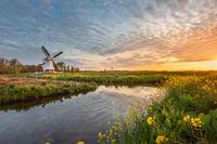 Het is lente en een hele windstille avond als de zon ondergaat. De gele bloemen maken de foto een fleurig geheel. De foto is gemaakt in april 2024