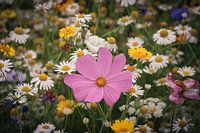 Een veld vol wilde bloemen, met één roze bloem die zachtjes het licht vangt. Alsof ze even zegt: kijk mij eens bloeien. De combinatie van fris groen, zonnig geel en subtiel wit geeft dit beeld een lichte, vrolijke uitstraling die meteen warmte in huis brengt.