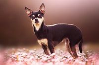 Een prachtig klein hondje (kruising) die aan het einde van de dag tussen de kleine bloemetjes staat. Het geeft een echt lente gevoel en een dromerige sfeer met zachte roze tinten.