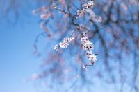 Dit is een verfijnde en dromerige fine-art close-up van delicate witte bloesem, vermoedelijk van een kersenboom. De tak hangt elegant in het beeld, waarbij de kleine, perfect gevormde bloemetjes scherp afsteken tegen de heldere, diepblauwe lucht. De rest van de takken en de achtergrond zijn opzettelijk wazig (bokeh) gehouden, waardoor…