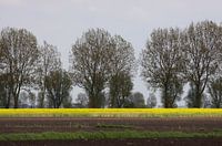 Een bloeiende koolzaad veld in de voorkant van een laan met bomen in de maand mei.
