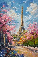 Uitzicht op een Parijse straat vol kersenbloesems en de Eiffeltoren - een lenteachtig motief met het uiterlijk van een schilderij.