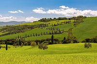 Uitzicht op het Agriturismo Podere Casanova bij Monticchiello in Toscane met een bochtige weg en vele cipressen.