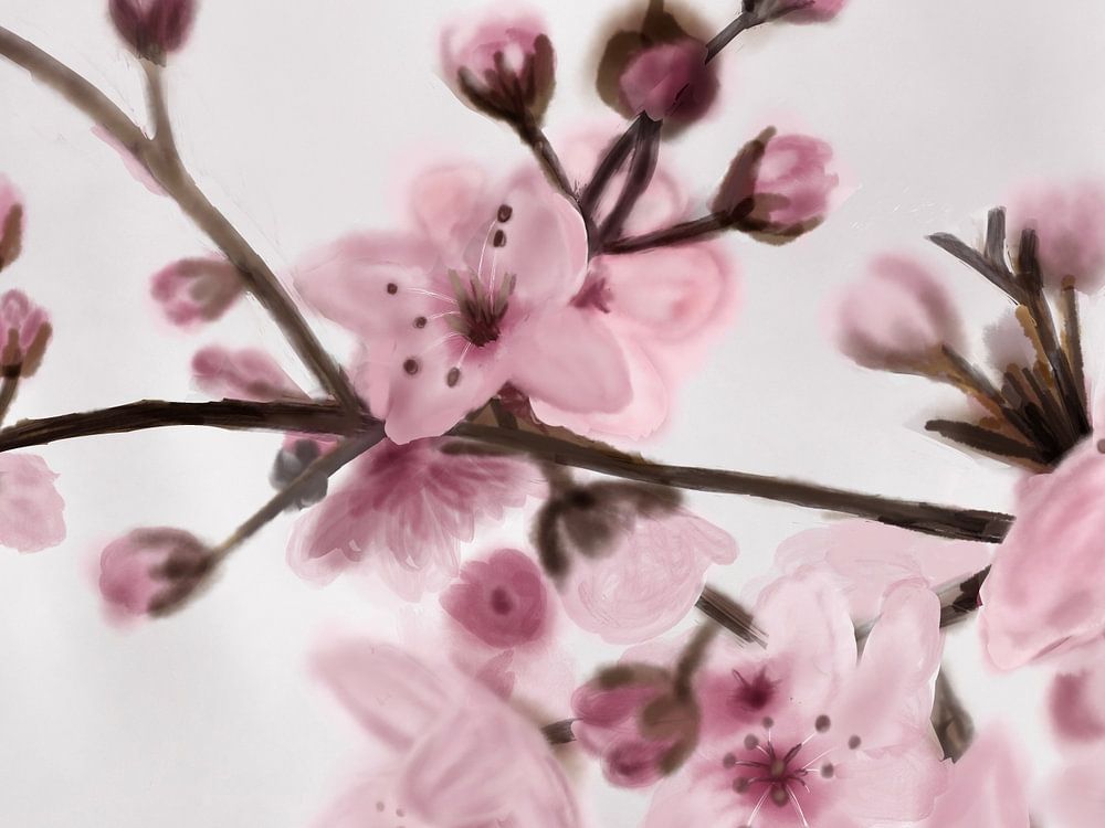 Dit digitale schilderij in aquarel stijl, toont een bloesemtak in volle pracht, met enkele roze bloesems die al zijn uitgekomen en andere nog in de knop. De grijzige achtergrond weerspiegelt het wisselvallige weer van het vroege voorjaar, waarbij de lente nog in afwachting is en de dagen nog koud en regenachtig zijn. Het werk straalt een gevoel van hoop en verwachting uit, met de belofte van nieuw leven en groei die in de lucht hangt.