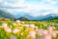 Lente-uitzicht in de Allgäu op de Allgäuer Alpen en de slotkerk St. Michael