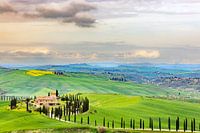 Huis met cipressenlaan in het voorjaar in Val d'Orcia, Toscane, Italië.