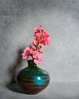 Een modern stilleven van een takje met roze bloesem in een klein vaasje met blauwe vlek tegen een neutraal grijze achtergrond