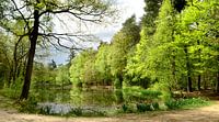 Een prachtig panorama van een bosrand met beukenbomen en dennenbomen. Het zonlicht op de verse beukenblaadjes maken het echt een voorjaarsbeeld. Een pad loopt rond een vijver en links staat een boom die nog kaal is waardoor de overkant mooi in beeld komt.