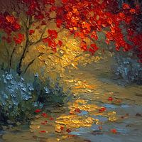 Digitale kunst in de stijl van een Impressionistisch schilderij van een bospad met goudgeel licht, rode herfstbladeren in de bomen en reflecties op de grond, omringd door groene en blauwe struiken.