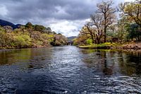 Een donkere rivier krijgt wat kleur van de vroege lentekleuren op de bomen ernaast.