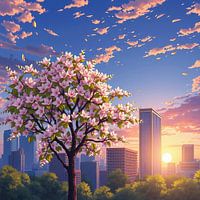 Een prachtige kersenboom in volle bloei staat op de voorgrond, terwijl in de verte de skyline van een moderne stad te zien is. De zonsondergang kleurt de lucht in warme geeltinten, terwijl de roze bloemblaadjes zachtjes wapperen in de wind. Deze foto combineert natuur en stedelijkheid in een harmonieuze balans.