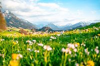 Lente-uitzicht in de Allgäu op de Allgäuer Alpen en de slotkerk St. Michael
