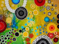 Een kleurrijk beeld, anticiperen op de lente met veel zon, schilderen in acryl op doek, contrasten, cirkelvariaties, een "goed humeur" beeld dat zeer decoratief is voor de moderne woonruimte, muurschildering voor kantoor en praktijk, niet-objectief en eigentijds, opgaan in lentekleuren met penselen en stiften, wat goed is voor…