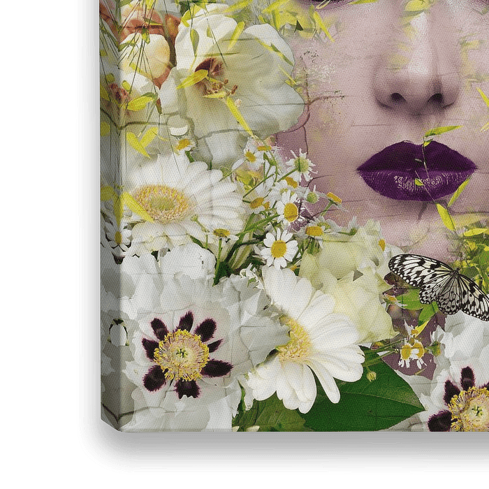 Een sfeerimpressie van de lente. Dit is een collage van verschillende foto's. De kleuren van de bloemen bladeren en vlinders brengen de lente in beeld. Een portret van een dryade met make-up. Het geheel vormt een wonderlijk surreële wereld.