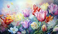 Vrolijke illustratie van een veld met lente bloemen in zachte pastel tinten.