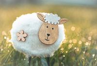 Close up van een decoratie schaapje in het met zonlicht overgoten natte gras. Deze foto leent zich perfect voor een kinderkamer of op andere plaatsen waar kinderen aanwezig zijn.