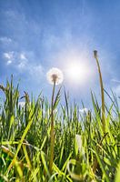 Opname van een uitgebloeide paardenbloem in het jonge gras. De zonnestralen en de blauwe lucht geven deze foto een echt lentegevoel!