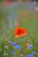 Een prachtige klaproos in een mooi veld lentebloemen, daar wordt toch iedereen vrolijk van.