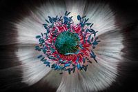 Mooie bloem in de tuin gefotografeerd. De fijne blauwe meeldraden steken mooi af op de rood, witte bloem. De bloemblaadjes zijn naar buiten toe meer zwart en geven daardoor een mooi dramatisch effect. Deze foto is geschikt als behang of kookplaat beschermer.