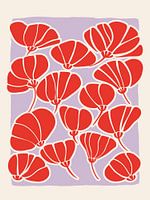 Bloemenelementen in rood op een lilakleurige achtergrond. De stijl is minimalistisch, maar toch met een vleugje kleur.
