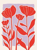 Bloemenelementen in rood op een lilakleurige achtergrond. De stijl is minimalistisch, maar toch met een vleugje kleur.