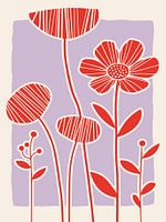 Bloemenelementen in rood op een lilakleurige achtergrond. De stijl is minimalistisch, maar toch met een vleugje kleur.