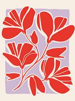 Bloemenelementen in rood op een lilakleurige achtergrond. De stijl is minimalistisch, maar toch met een vleugje kleur.