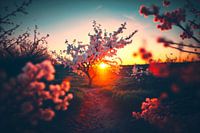 Terwijl de lentezon langzaam begint te zakken, kleurt de lucht in prachtige tinten van oranje, roze en geel. De gloed van de zon verlicht de omgeving en zorgt voor een warme en vredige sfeer. In het midden van het beeld staat een kleine boom met roze bloesem die zachtjes wiegen in de zachte lentebries.